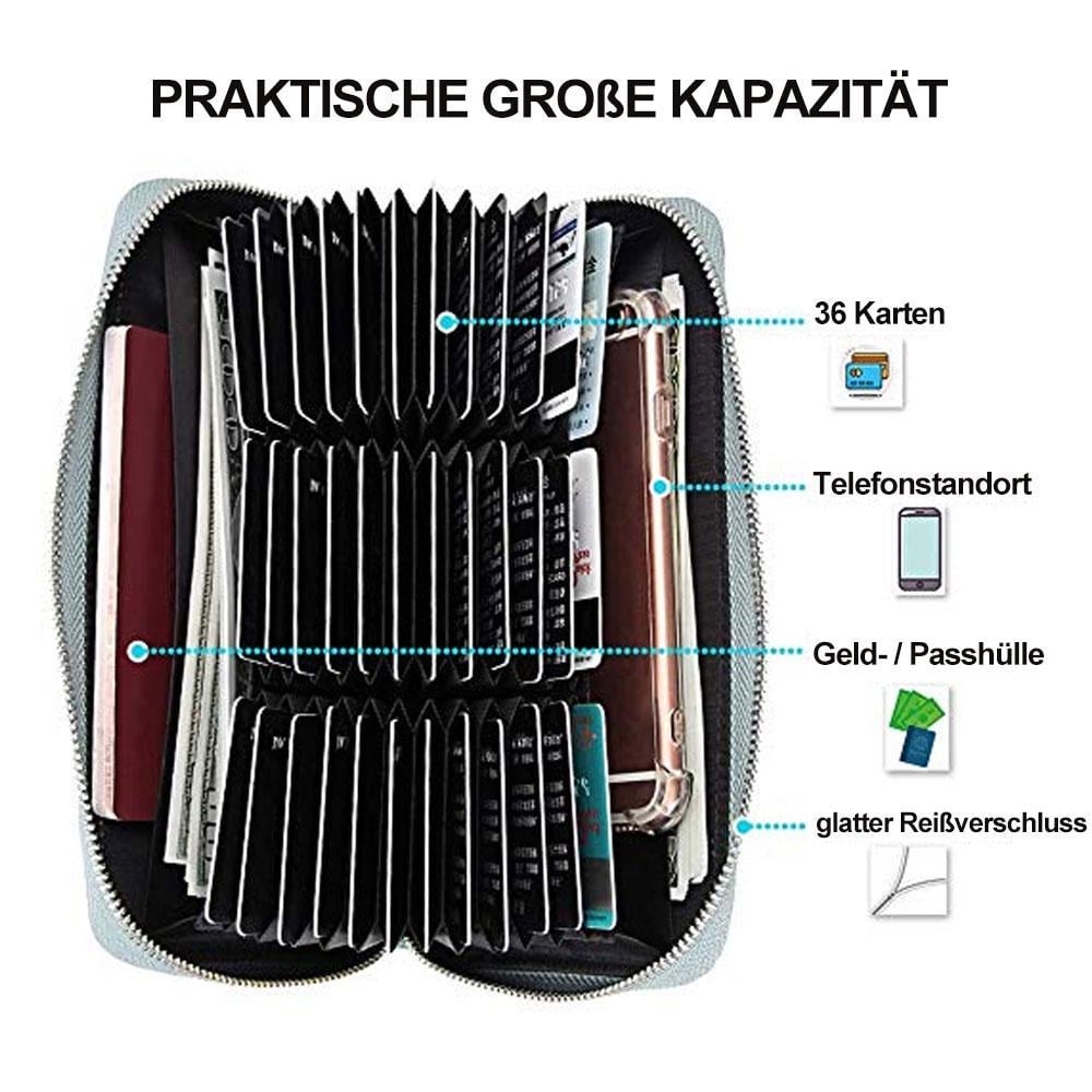 Große Kapazität: 36 Kartenfächer + 2 Bargeldfächer + 2 Innentaschen. Die Größe der RFID-Brieftaschen beträgt 21*12*6 cm. Es gibt viel Platz für Scheckheft, Bargeld, Smartphone, Kreditkarten, Debitkarten, Ausweise, Studentenausweise und viele andere Arten von Karten.